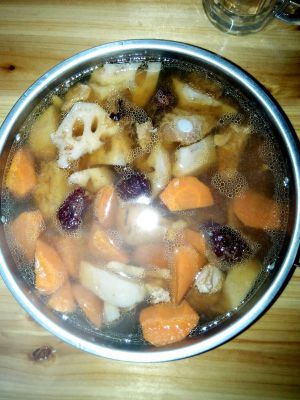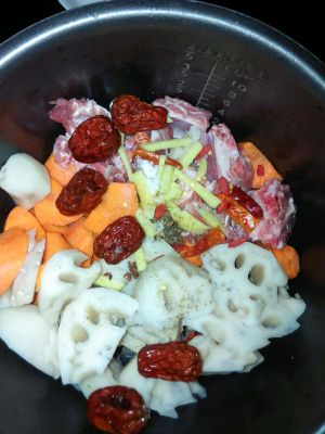 将排骨、莲藕、胡萝卜一起放在锅里,并添加调料(姜、八角、红枣、枸杞、五香粉)