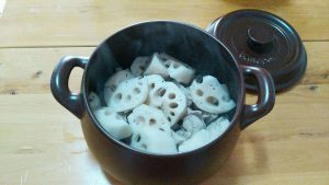 放入玉米,藕,香菇,葱,并调入少量醋和适量料酒,盐,大火煮开后转小火继续煮