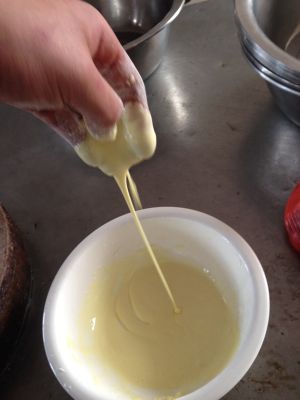 炸前调制面糊,稍稠一点,容易脆,把腌好的肉挑出姜扔掉,倒入面糊中