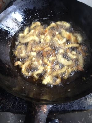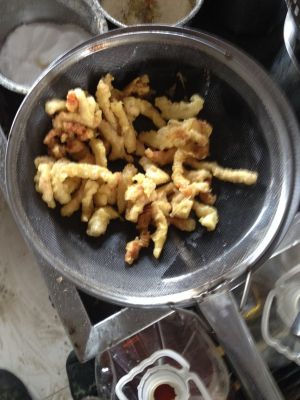 锅烧热倒入适量的油,烧至七成热,放入里脊条大火炸。