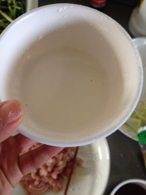 加入4勺玉米淀粉和3勺清水搅拌均匀成糊状。(看里脊条的状态,可以适当调整用量。)