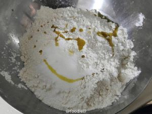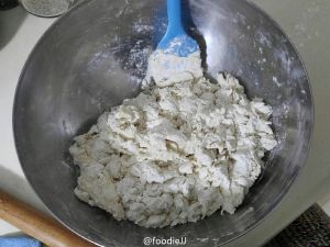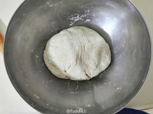 用手在钢盆中搓揉面团。继续搓揉后,松散状面团即成完整的面团。