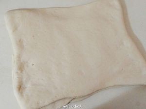 面团三折后呈长方形,再将长方形面团均匀地向四周擀开、擀平,使得面团之间紧密黏合,最后成为长约45厘米、宽约25厘米的长方形。