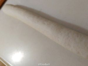 去掉面团表面多余面粉,再均匀地刷上清水。长方形面团的一边需用擀面杖擀薄,以利卷完后的面团容易黏合。由面团的边缘开始紧密地卷起,卷成圆柱体后,从面团中心向两边轻轻搓揉,使面团粗细均等,最后搓成长约50厘米的圆柱体。