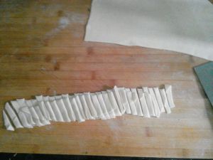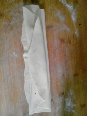 3.把面皮擀薄一点,上面撒上一点面粉然后折叠成这样。