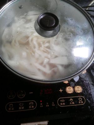 开锅后,放入适量面条。面条熟透后,加入鸡精补味。