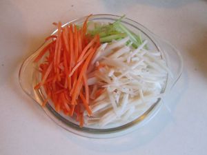 红萝卜,青瓜,切丝,木耳浸透,切丝。