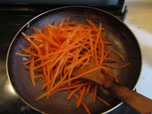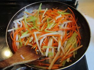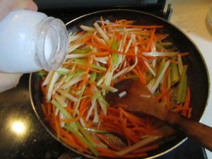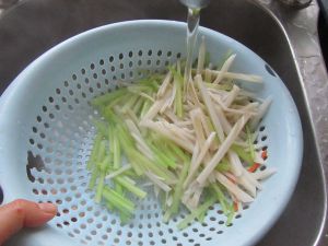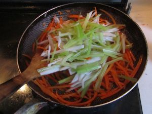 煸炒到红萝卜微微出红油时下入焯过水的西芹和藕丝翻炒;