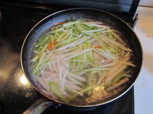 烧锅水, 加入盐和几滴油,水开后放入藕丝和西芹丝炒烫;