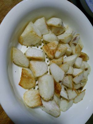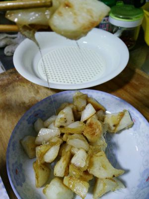 鍋內放油燒熱,山藥炸至金黃色撈出,控油