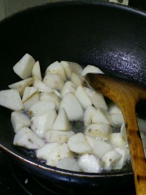 山药切滚刀块后,用水清洗一下后撒淀粉将山药裹匀,下锅油锅炸至金黄色,建议分两次过油,在弄山药去皮时最好带上手套不要接触皮肤。