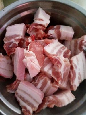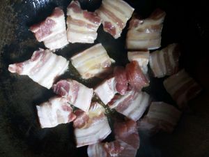 锅内少许油中火煎肉,肉稍变色后加些许冰糖炒糖色