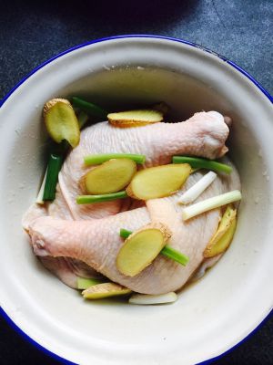 炒好的盐均匀抹在鸡身上 撒葱段 姜片 少量白酒 枸杞