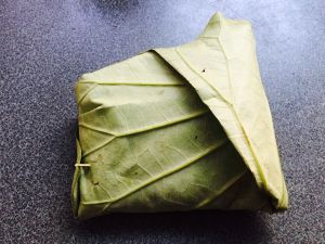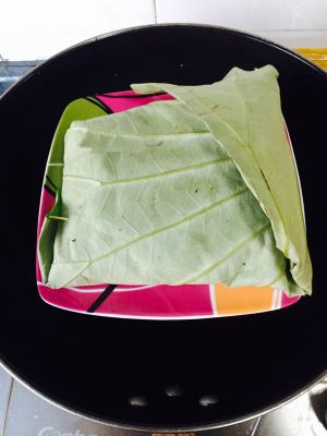 开始用荷叶包,这个步骤不需要什么好看的形状,大家随意,只要荷叶不散,里面的食材不掉出来就行。这里建议大家提前准备麻绳,稍微捆一下,就不会漏了。