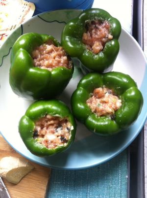 把调好的肉末均匀地塞进切好的青椒上面,备用