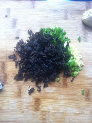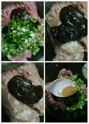 往肉末里加蛋、葱姜、木耳、生抽、盐、味精、蚝油。用筷子顺时针搅至上劲。