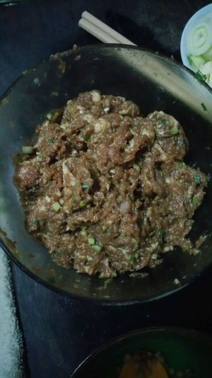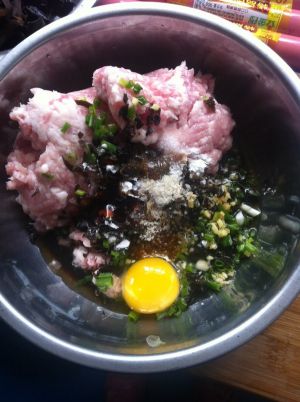 肥瘦猪肉加入盐'生粉,蚝油,鸡精,葱花,大蒜,剁成肉馅