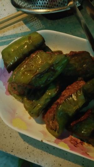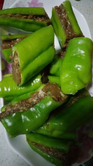 青椒洗干净切成两半,把里面的辣椒籽挖干净,要挖干净不然会有辣味的,然后就把剁好的肉馅酿进去辣椒里