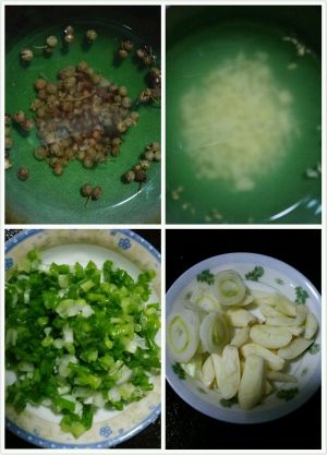 花椒和姜末分别泡热水,准备小葱末,大葱和蒜末