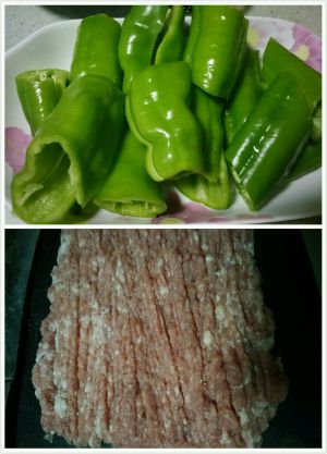 青椒切合适的段,中间切一刀;肉剁馅,也可直接买现成的肉馅.