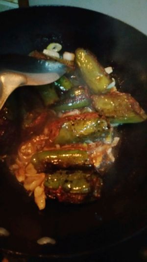 接下来就是炒酿青椒了,锅烧热放油,放入酿青椒放入生抽盐,炒香,放少许水,盖上锅盖焖干,翻炒香后在放入水,重复上面的做法,炒干后放入鸡精翻炒就可以出锅