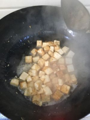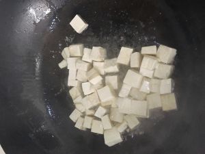 待锅底烧热,在加入食用油,防止粘锅,油热后加入豆腐块煎..