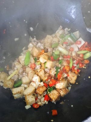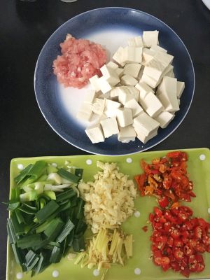 食材准备到位,蒜头切末,新鲜蒜、干辣椒、小红椒切小段、(姜丝对自己口味加入,吃不了辣的童鞋建议不要放)水豆腐切小丁块,瘦肉切细成肉末,准备即可