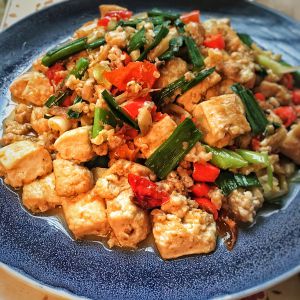 切下来,蒜末、姜丝、干辣椒、小红椒下锅煸炒,再加入切好的新鲜蒜叶炒,最后加入刚煎制的豆腐块翻炒,加入一小勺盐、少许蚝油翻炒,最后倒入少许生抽提鲜即可出盘...上桌