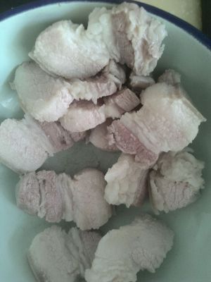 猪五花肉切成肉丁,冷水下锅,水没过肉