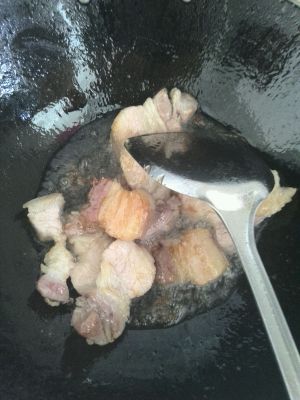 放入待用的五花肉,一起翻炒至出油,,放入切碎的姜蒜,五花肉上色成功