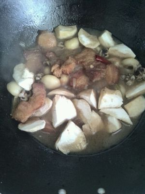 放入水,没过肉,大火烧开,改中火焖二十多分钟,期间放入柱侯酱,香料(我加入的是包子馅调料)。还剩三分之一的时候加入芋头i