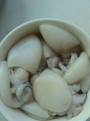 墨鱼仔去掉内脏,眼睛和口器,清洗干净后,放入料酒,干姜粉腌制。