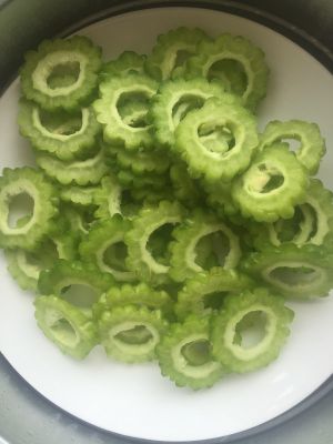 苦瓜洗净切段。不要太厚,太厚会很苦,筷子最厚处那么厚就行。去籽。