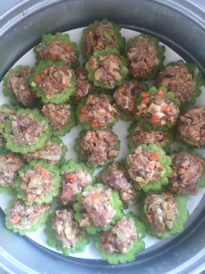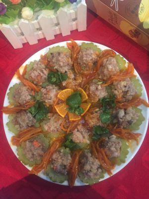 苦瓜放上肉馅,摆盘,大的在外圈,小的在里圈。蒸锅加水,凉水时就放入苦瓜开始蒸,水开后10分钟就熟了。蒸熟慢慢倒出盘里的汤汁。炒锅加点油,炒熟胡萝卜,再加2汤匙番茄沙司酱,加入苦瓜汤汁,烧开,淋入少许玉米淀粉,加香油出锅。
