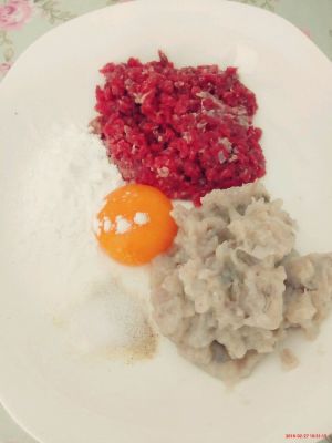 如图,羊肉剁糜,虾也成泥(我用的虾滑),蛋黄,盐,胡椒粉,玉米淀粉,差不多就是这个份量,大家参考一下