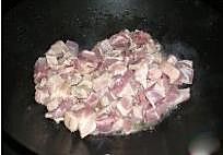 起油锅,倒入少量油,放入腌制好的五花肉,小火慢慢煎炒。炒制颜色微微发黄即可捞出沥干油备用。(此步不用水焯,直接下油锅翻炒的目的是为了能煸出五花肉中过多的油份,吃起来不腻,还可以增加肉的香味。)