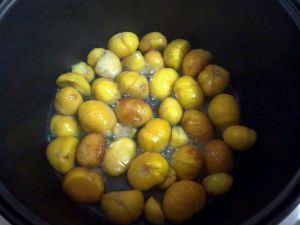 油锅预热,翻炒板栗,加水盖至板栗一半,煮开。