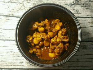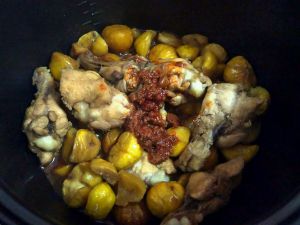 将鸡块和板栗一同放入锅中,焖15分钟后,放入盐和鸡精。
