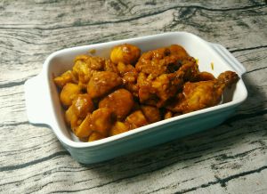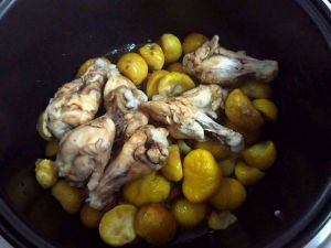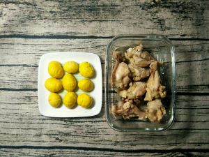 4.鸡块表面微黄后调入料酒,酱油,盐,少许白糖加入板栗。