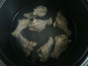 翅根焯水,去皮。 没错,就是要去皮! 不吃皮的人表示,很郁闷,干脆去掉吧,脂肪也少点,多棒~