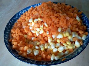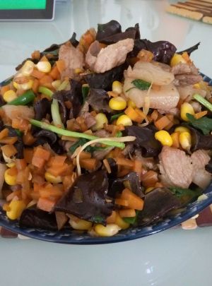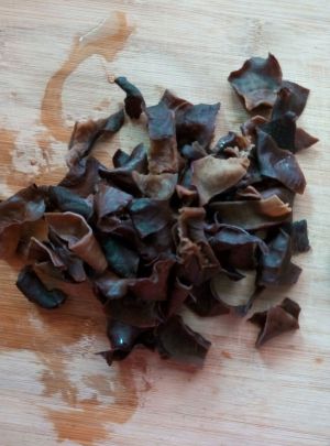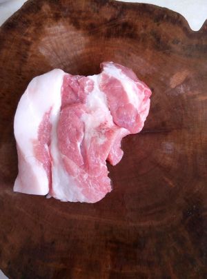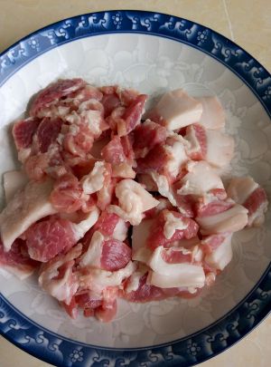 猪肉切片(也可以切成肉丁),拌上盐、酱油、玉米淀粉,