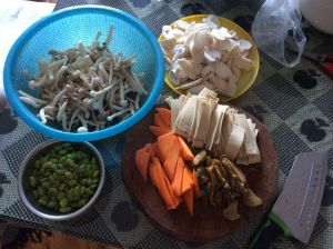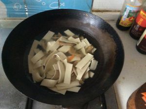 锅里放水,放入百叶,榨菜,焯一下,去除豆味和榨菜的咸味。