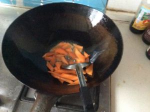先放猪肉小炒一会然后放土豆红萝卜翻炒,放适量盐油调味,放水下盖,差不多好的时候再放青椒翻炒