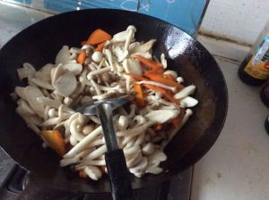 番茄软烂出汁以后放入适量水,加入杏鲍菇,翻炒一下