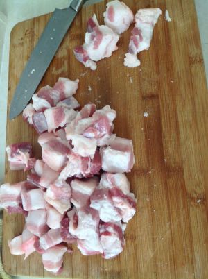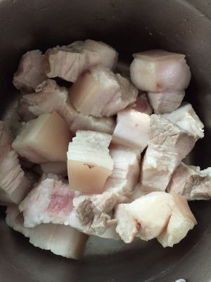 五花肉切大块些,下凉水锅焯出血水。放姜片若干,水开后3分钟起锅用温水冲洗血沫