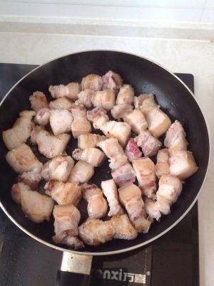 锅中放少许油,小火煸香八角,桂皮,干辣椒后放焯水后的五花肉块中火炒至微黄起锅。