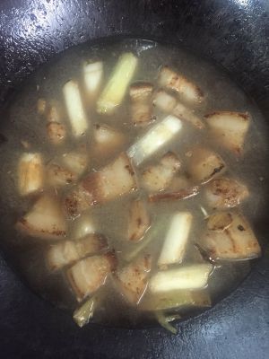 锅里放冰糖,炒出糖色后加入红烧肉翻炒均匀裹上糖色,再加入生抽老抽