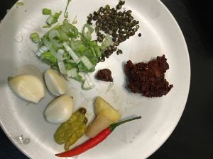 将辣椒、泡姜、蒜瓣切碎
