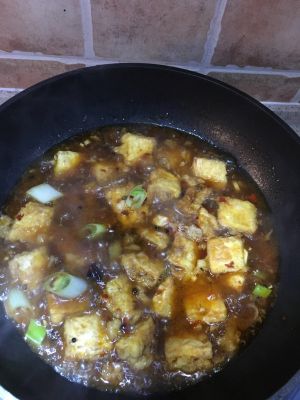 热锅,倒入一适量过滤的油烧热,将上图中的调料如果炒料,再加入适量酱油、醋、糖(具体根据自己口味定)小火炒香,加入水烧开,将炸好的豆腐夹入锅炖