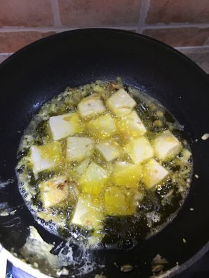 豆腐切块,平底锅放油,中等油温放入豆腐煎到两面黄。